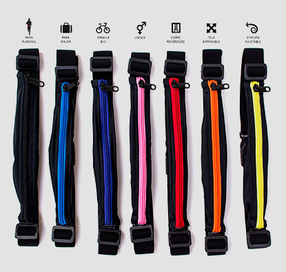 Se expande hasta contener objetos voluminosos y es adaptable a cinturas entre 50 y 160 cm. Colores disponibles: negro, azul, violeta, verde, amarillo, rojo, naranja, fucsia